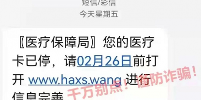 近期有不法分子利用“醫(yī)保停用”等相關題材,向參保人員發(fā)送詐騙短信,點開鏈接后跳轉的頁面與國家醫(yī)療保障局官方網(wǎng)頁非常相似,但內含木馬病毒鏈接,如果按頁面上的提示填寫身份證號、銀行卡號...